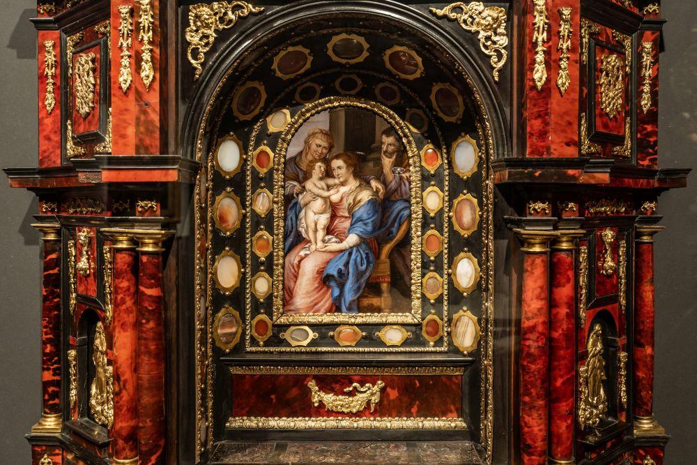 "At the centre of this beautiful Baroque home altar, you can see a miniature of a painting by Rubens. The contrast between the ebony, tortoiseshell (the mottled red shell of a tortoise - ed.), gold and copper is remarkable. This is almost kitsch, as lavish as this piece of furniture is. It fits perfectly with the Rubens House: on the one hand, there is that homely feel; on the other, it is an illustration of Rubens' sumptuous interior. The same applies for the house of Moretus, where this piece belongs just as well. A home altar is typically a piece that is found in private quarters. At Museum Plantin-Moretus, you now find it in the sleeping quarters, where it fits well with the rest of the decor."