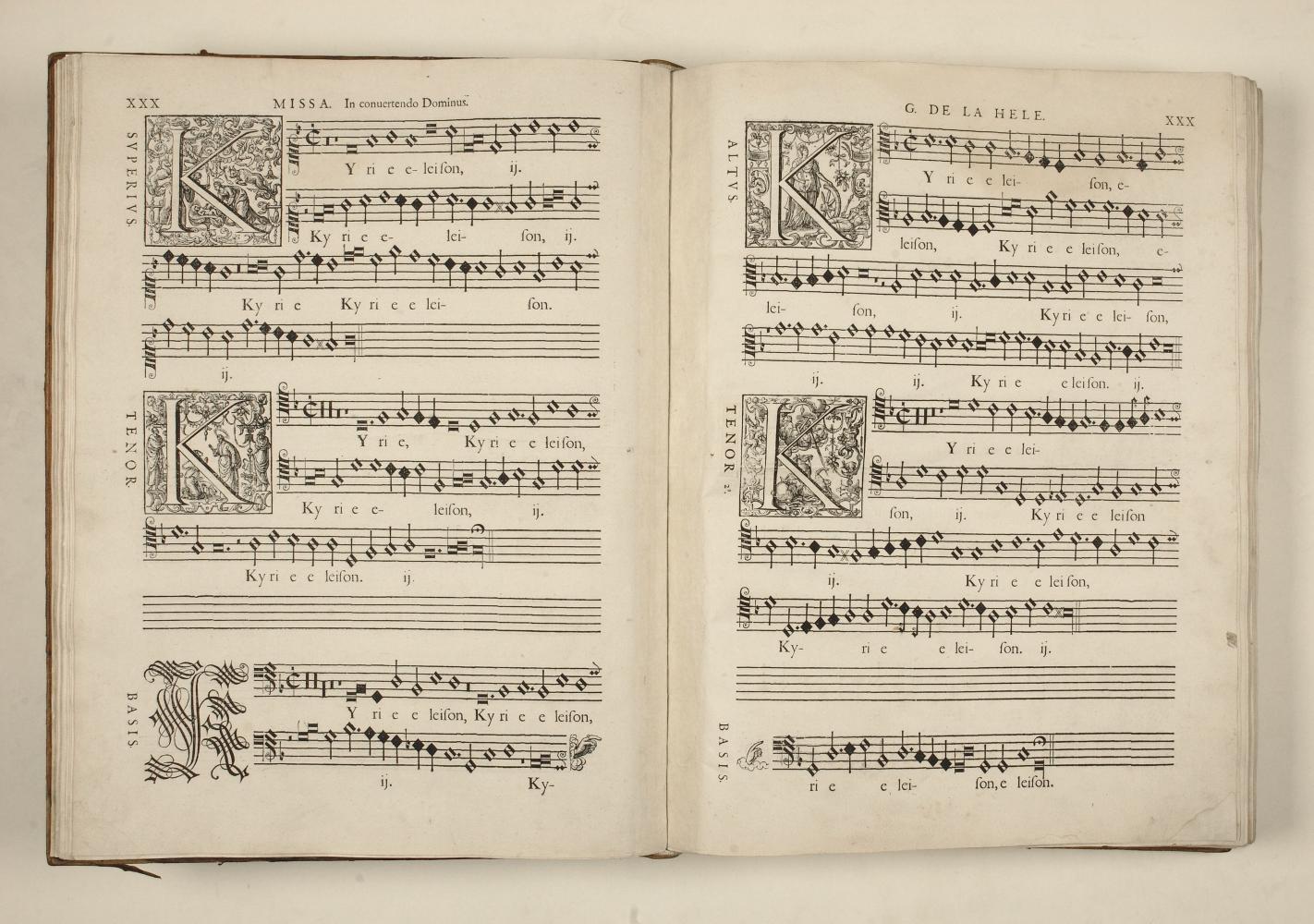 The Antwerp-born composer Georges de la Hèle (1547–1586), under whose name the work was published, worked mainly for the Habsburg court in Spain and the Low Countries. This publication is the most important work of his that has survived; the rest was lost in a fire in Madrid in 1734. The musical notation was cut by the Ghent engraver Hendrik van den Keere, with whom Plantin collaborated regularly. This work stands as a fine example of the outstanding typography of Christophe Plantin’s printing house.