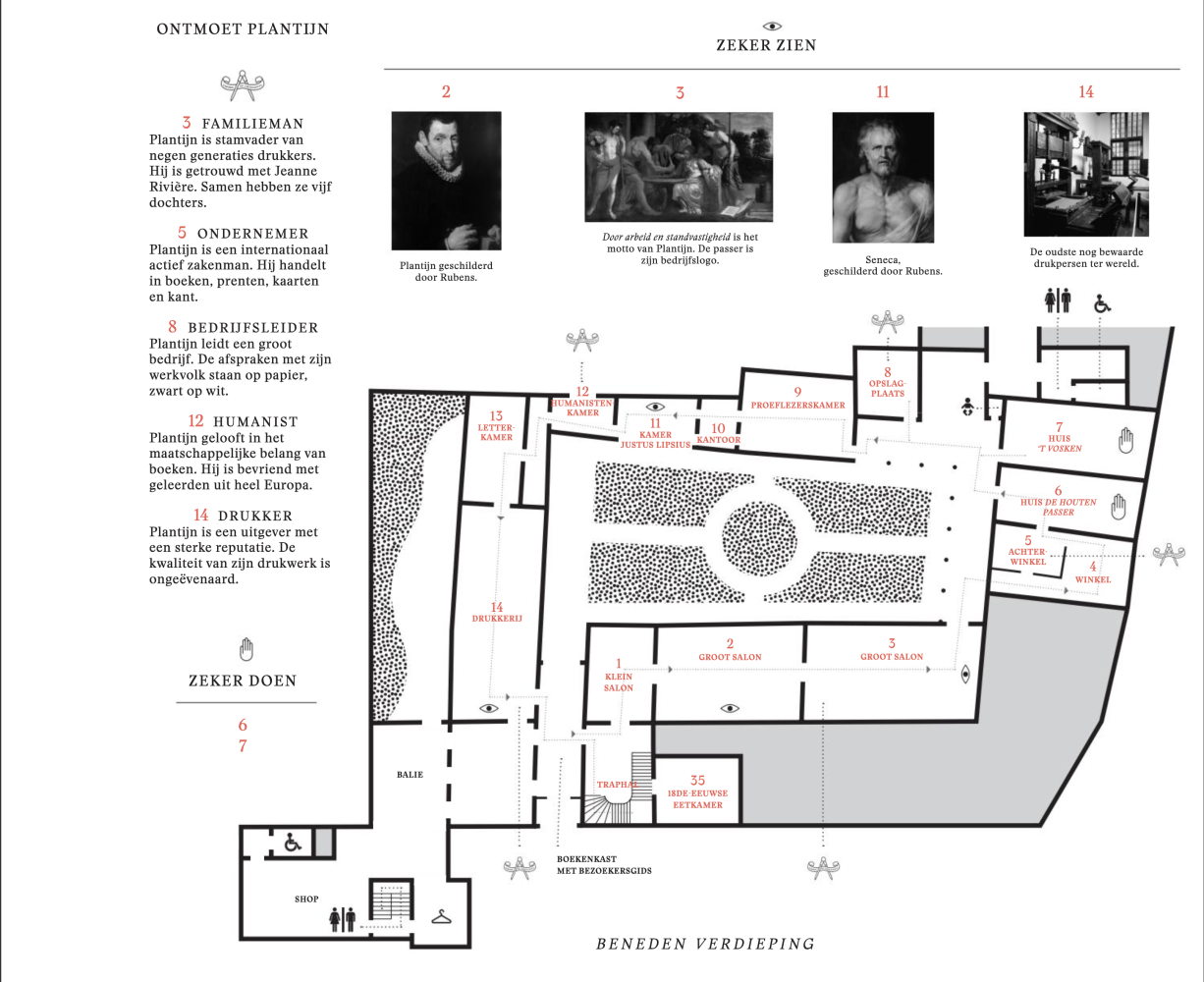 Visit the Museum Plantin-Moretus in one hour with the floor plan. This plan guides you along the museum’s highlights. You’ll receive the floor plan at the start of your visit.