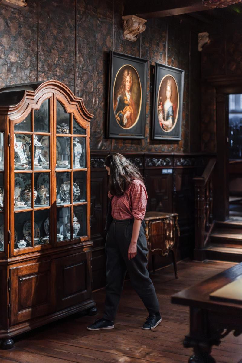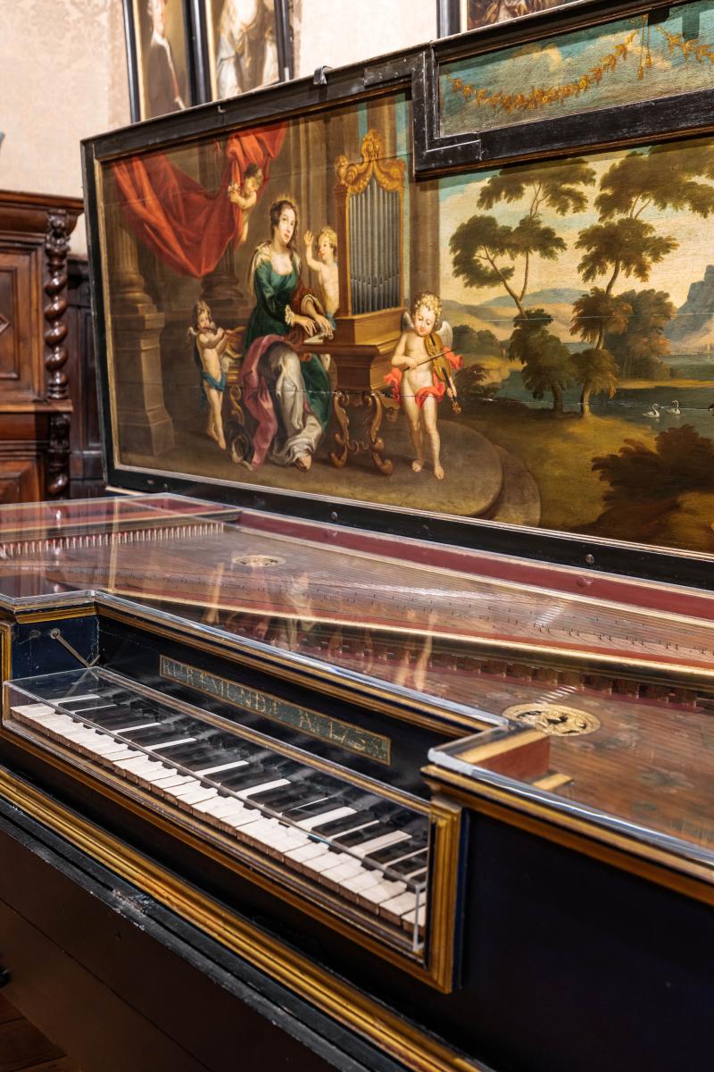 The furniture further emphasises the family’s wealth. The elegantly painted cabinet is full of drawers and hidden compartments – ideal hiding places for important paperwork and small, valuable objects such as jewellery, coins, and fabrics. The ebony cabinet features 23 biblical scenes painted by Hans Jordaens and rests on the sturdy shoulders of four sculpted figurines. Further in the room lies another historical gem: a double harpsichord, of which only a handful remain in the world.