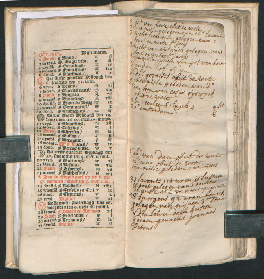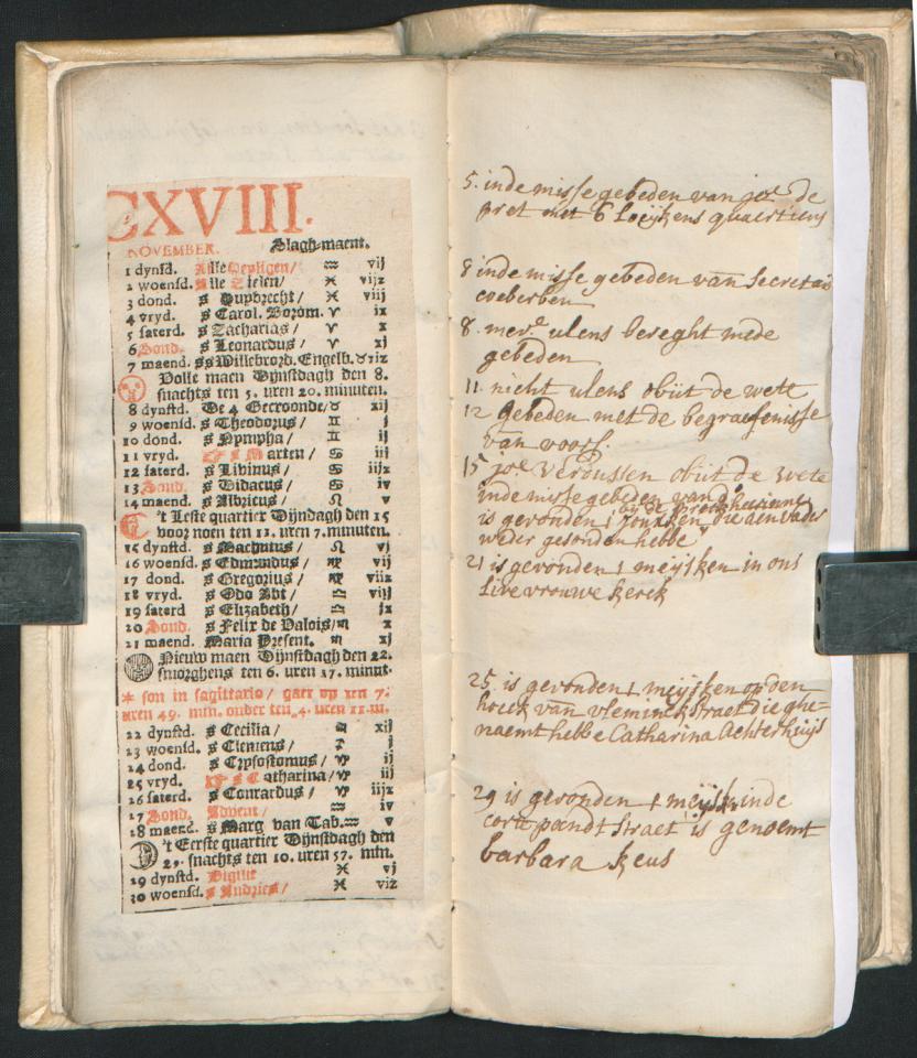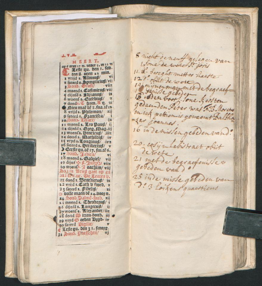 Voor het bijhouden van haar dagboeken maakte Theresa Mathilde Schilders (1696–1729) gebruik van almanakken. Deze gedrukte kalenderboekjes bevatten de astronomische evenementen en de religieuze festiviteiten voor het komende jaar. De almanakken van Theresa Mathilde waren eigenlijk gedrukt om als affiche aan de muur te hangen. Haar boekverkoper had evenwel de maanden uitgeknipt en in een handig notaboekje gekleefd. Per opening vind je de gedrukte maandkalender aan de linkerkant. Op de blanco pagina aan de rechterkant kon je aantekeningen maken. Theresa Mathilde gebruikte de vrije ruimte om een dagboek bij te houden van de belangrijke gebeurtenissen in haar leven. Haar almanakken uit de periode 1718–1723 zijn bewaard gebleven in het Plantin-Moretusarchief. Speciaal voor dit blogbericht werden ze gedigitaliseerd.