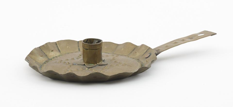 In de donkere uren verlichtte men de drukkerij met kaarslicht. In de archiefbronnen is alleen sprake van kaarsen en niet van olielampen. De drukkerij werd niet verlicht met een centrale kroonluchter. Elke werknemer had zijn eigen kaarsenpan of blaker waarvoor hij persoonlijk verantwoordelijk was. Dit is een voorbeeld van een blaker uit de collectie van het MAS. Een blaker is een lage kandelaar met een brede, platte voet, voorzien van een schaaltje, en een oor of handvat. Behalve de zogenaamde ‘pannekens’ is er in de archiefbronnen sprake van profijters Het MAS gebruikt deze term voor een kandelaar met spiraalschacht. Maar de term kan ook slaan op een met pinnen voorzien plaatje om eindjes kaars profijtelijk te laten opbranden, en dat bevestigd werd op het pijpje van een blaker. Beide kaarsenstandaards hebben gemeen dat ze ontworpen zijn om eindjes kaars profijtelijk op te branden.