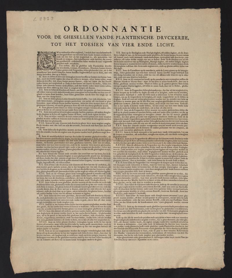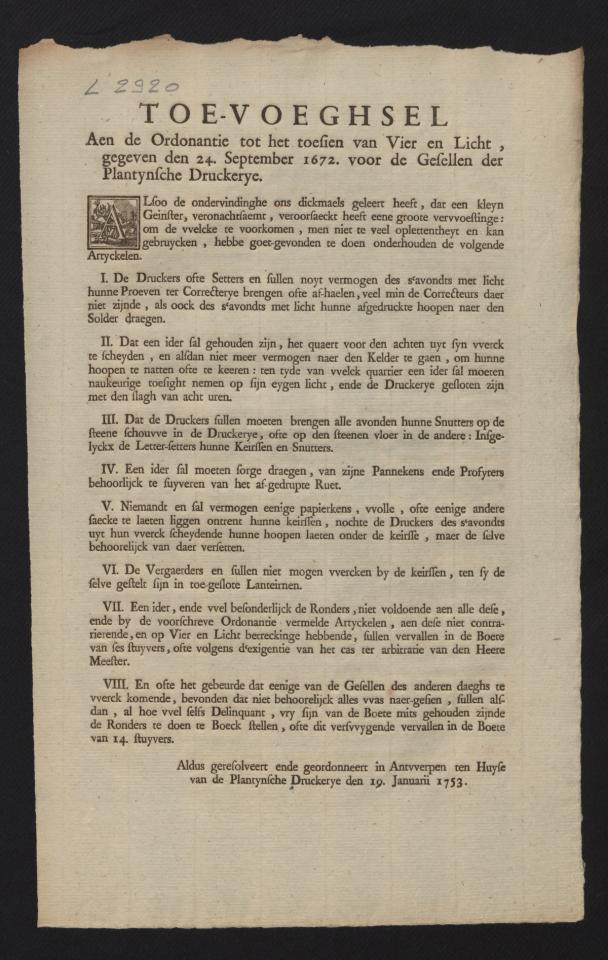 In een vroegmoderne drukkerij waren brandbare materialen alomtegenwoordig, denk bijvoorbeeld aan de stapels papier, de houten drukpersen, en de houten letterbakken en galeien van de letterzetters. Een ongeluk was snel gebeurd, en een brand kon een enorme verwoesting aanrichten. De meesters van de Gulden Passer legden logischerwijze sterk de nadruk op brandpreventie. In 1672 vaardigde Balthasar II Moretus een uitvoerig en gedetailleerd arbeidsreglement uit louter over brandpreventie. De zogenaamde ‘ordonnantie van de gezellen van de Plantijnse drukkerij over het toezicht op vuur en licht’ telt 33 artikels en ruim 2.000 woorden. Ze werd in twee kolommen op een groot planovel gedrukt. Het papier meet 55 op 45 centimeter, en heeft dus het formaat van een hedendaagse affiche.