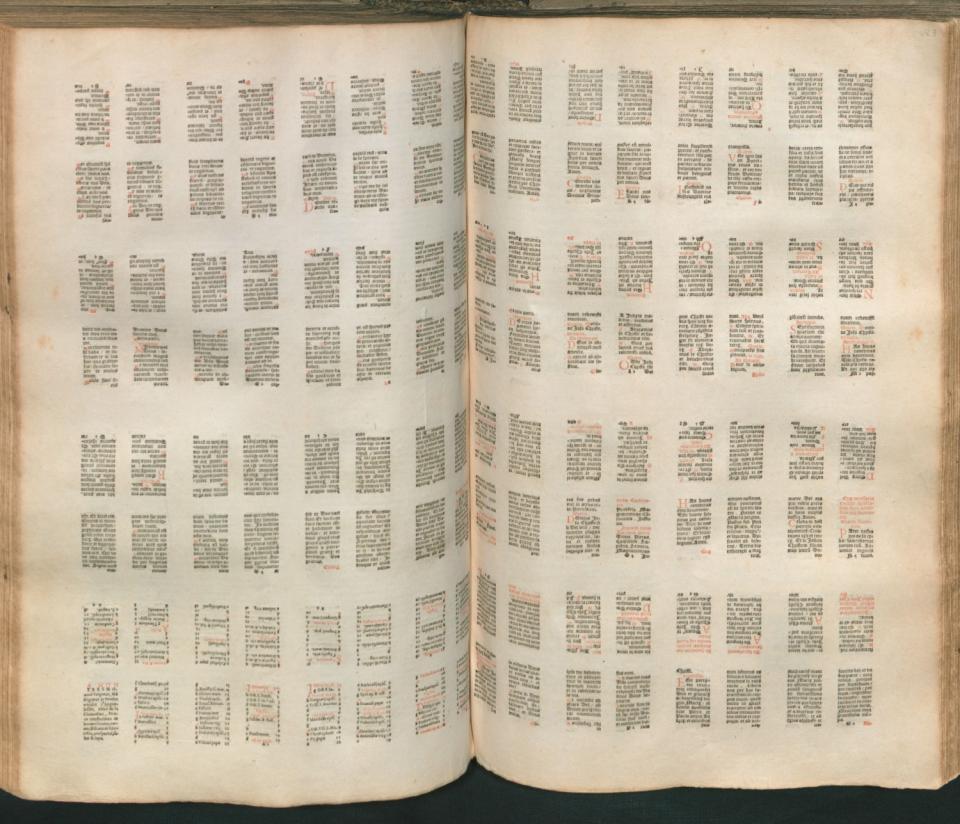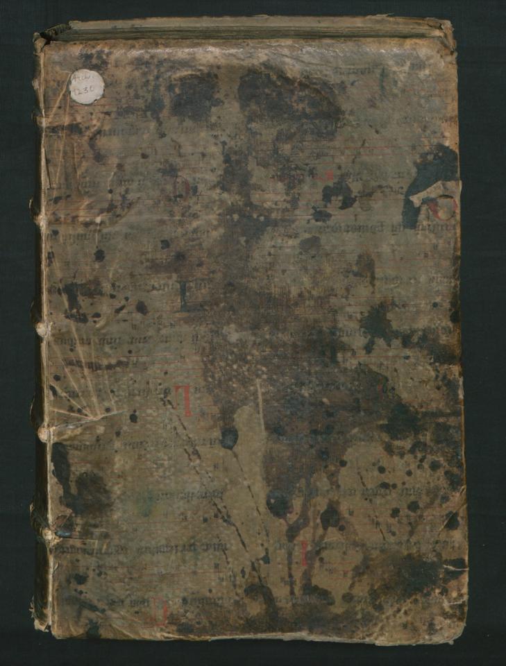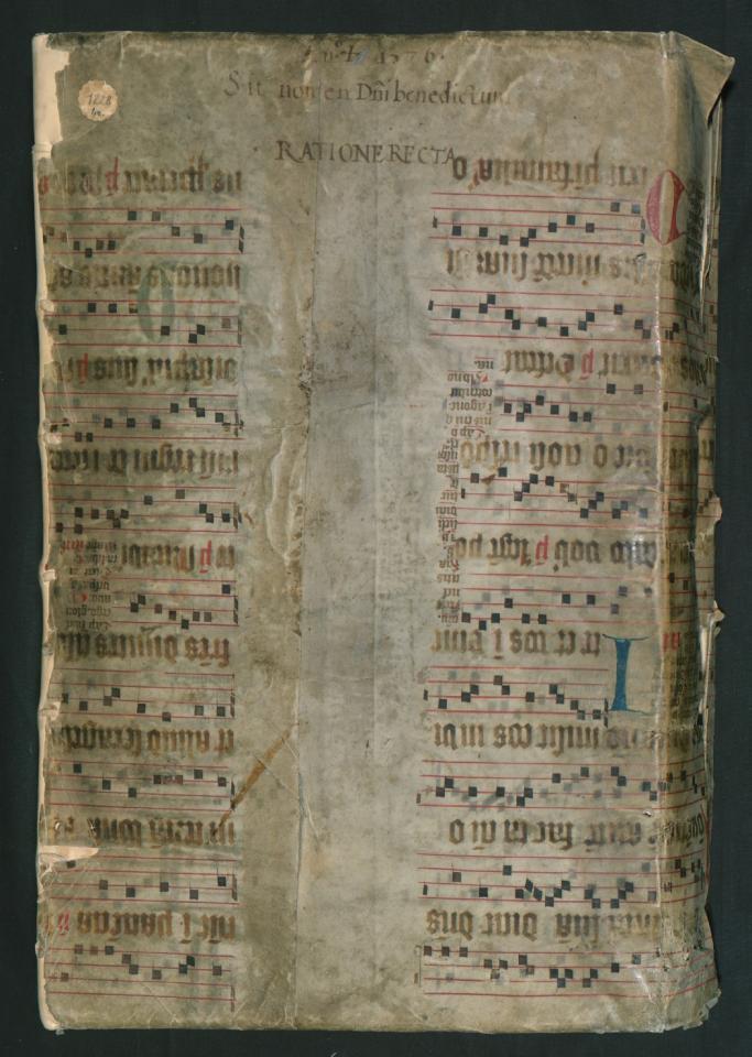 Zelfs met dit ene deel kunnen we dit staalboek van de Officina Plantiniana best indrukwekkend noemen. Met een dikte van ruim 10 cm werd het een lijvige foliant. Alle katernen werden slechts één keer gevouwen en niet het aantal keer dat werkelijk nodig is voor het specifieke formaat van de geselecteerde edities. Voor de band recupereerde Jan Moretus het manuscript van een middeleeuws Antiphonarium. In het verleden had een perkamenten handschrift een heel andere waarde voor de Plantijnse drukkerij. Ze werden gerecycleerd om de frisketten en de timpanen van de drukpersen te bespannen. Voor dit doel had de drukkerij een grote voorraad in huis. Ruim vier eeuwen later ziet de boekband er niet meer zo fris uit. Het perkament is sterk verdonkerd, en talloze inktvlekken ontsieren de muzieknoten van het oude Antiphonarium. Vandaag staat het nieuwjaarsgeschenk bekend onder het inventarisnummer Arch. 1230. Naar aanleiding van dit blogbericht hebben we het boekdeel volledig gedigitaliseerd.
