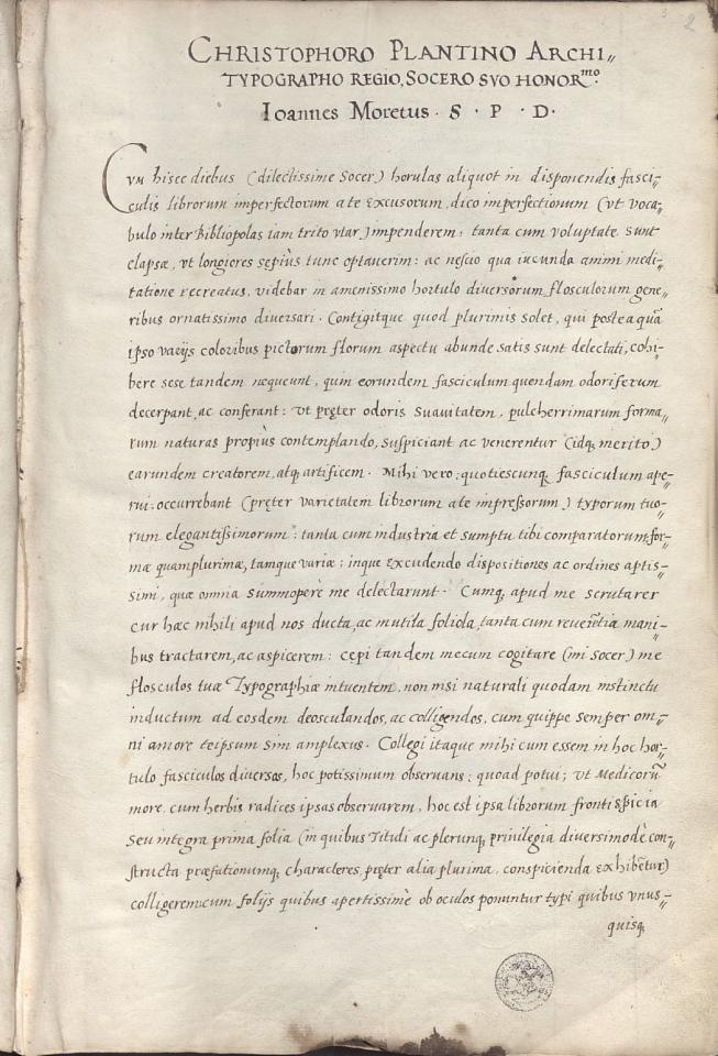 Na de titelpagina volgt een Latijnse opdracht van Jan Moretus aan zijn schoonvader Christoffel Plantijn. Moretus was in 1570 met Plantijns tweede dochter Martina gehuwd. Tegen nieuwjaarsdag 1575 had het echtpaar al drie kleinzonen aan opa Plantijn en oma Jeanne Rivière geschonken. Jan en Martina hadden ze naar de Driekoningen Gaspar, Melchior en Balthasar genoemd. Nadien zouden nog acht kinderen volgen. In het totaal bereikten slechts vijf kinderen van Jan en Martina de volwassen leeftijd.