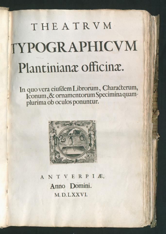 Een jaar later, op 1 januari 1576, gaf Jan Moretus zijn schoonvader een nieuwjaarsgeschenk dat nóg indrukwekkender was. Het Theatrum typographicum Plantinianae officinae is een plakboek met honderden titelpagina’s en boekillustraties van de Plantijnse drukkerij. De titelpagina’s zijn geordend volgens onderwerp. Moretus begon met het meest prestigieuze werk dat ooit in de Plantijnse drukkerij werd gedrukt, met name de Bijbel in de vijf oorspronkelijke talen (Biblia Regia). Nadien volgden titelpagina’s van liturgische drukken en theologische werken. Meer naar het einde toe plakte Moretus de botanische houtsneden van Dodoens en de anatomische gravures van Valverde in het monumentale staalboek. Jan Moretus stak ook bijzonder veel ijver in de titelpagina van het geschenk, die hij zoveel mogelijk op een gedrukte titelpagina liet lijken. Hij sneed een échte gravure van het Plantijnse drukkersmerk met de Gulden Passer uit en plakte dit op de voorziene plek op de titelpagina.