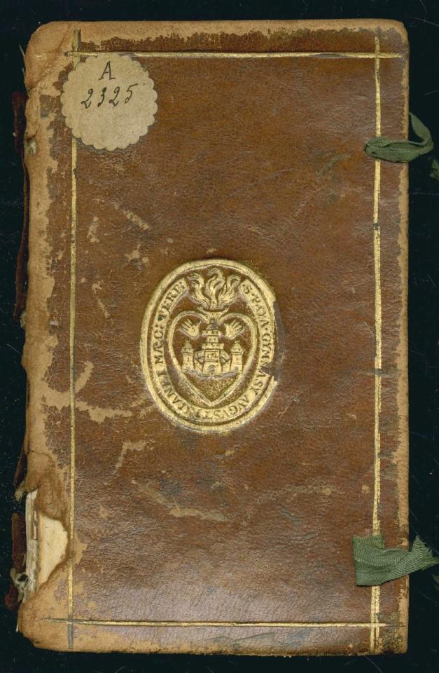 Het Antwerpse augustijnencollege heeft het prijsboek in een speciale prijsband laten inbinden. Op het voorplat van de kalfsleren band werd het wapen van het college in goud gestempeld. Het brandende hart is het herkenningsteken van de orde van de augustijnen. Het staat symbool voor het brandende hart van Sint-Augustinus voor de liefde tot God en de medemensen. De burcht en de handjes binnen in het hart verwijzen naar het wapen van de stad Antwerpen. Rondom het hart staat ‘S.P.Q.A. GYMNASY AVGVSTINIANEI MÆC: PERP:’. Met deze stempel positioneerde het gymnasium van de augustijnen zich als bestendig mecenas van de stad Antwerpen en haar inwoners.