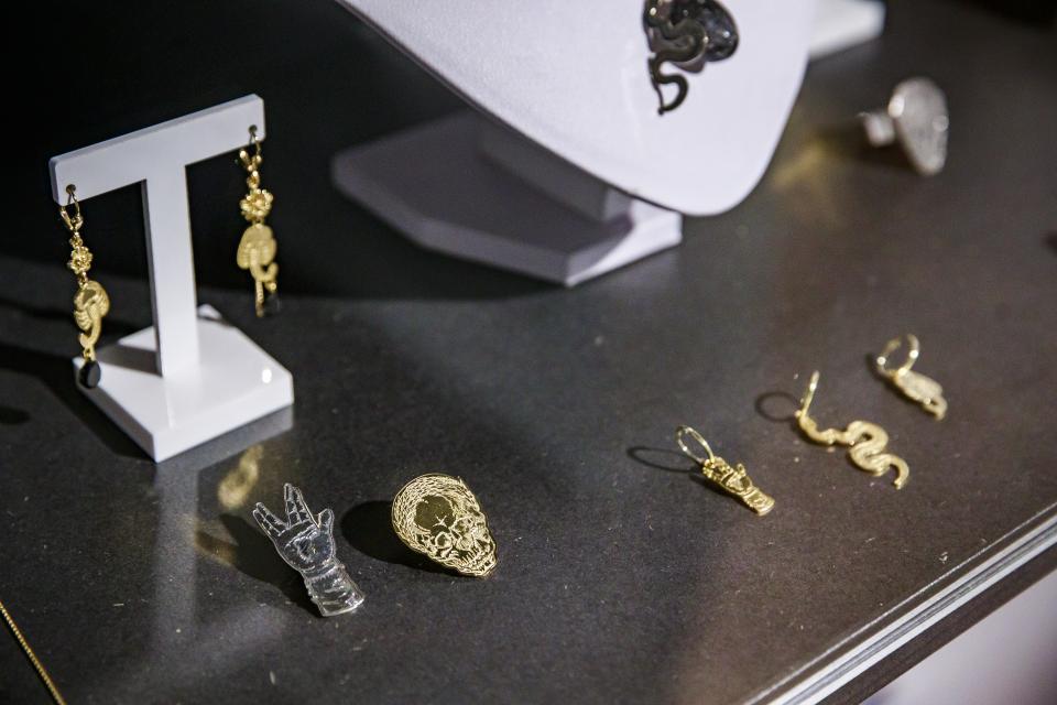 ‘En het leuke is: het zijn geen kunstwerken alleen’, vertelt Colpaert. ‘Geen historische objecten die je vooral niet mag aanraken en enkel mag bekijken achter dikke glazen wanden. Nee, je kunt ze ook dragen: in je oren, rond je vinger, om je hals. Eeuwenoude tekeningen die tijdloos modern blijven.’