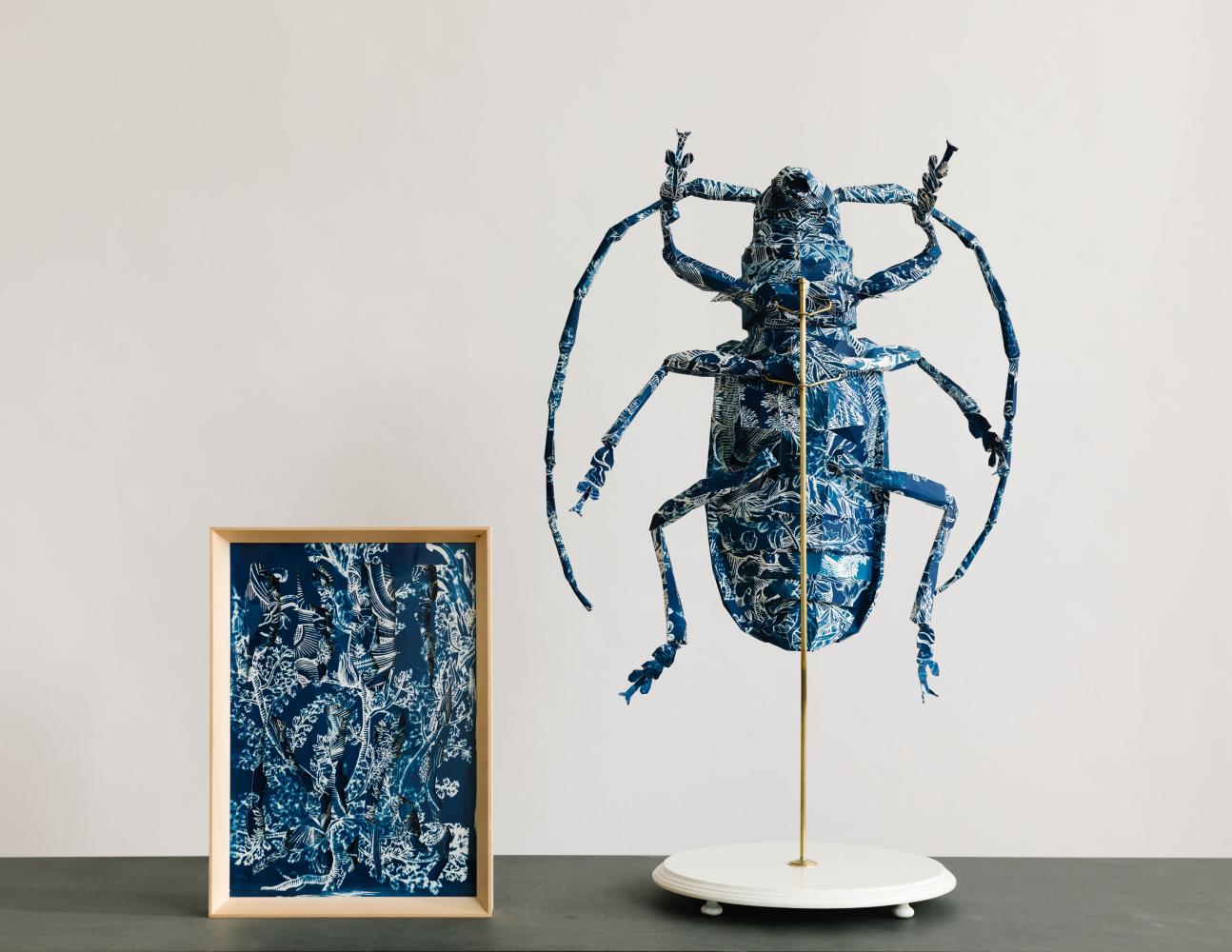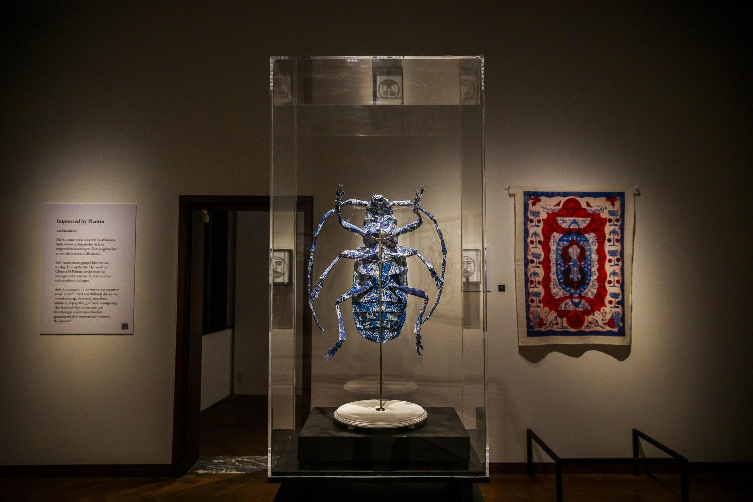De collectie van Plantijn komt in het werk in meerdere lagen terug. ‘De papieren vellen waaruit ik de patronen sneed, had ik op voorhand bedrukt. Op elke plaat een uitvergroting van een plant uit de verzameling, zo’n 25 verschillende in totaal. De boktor is dus opgebouwd uit een aaneenrijging van historische planten, de natuurlijke omgeving waar zo’n kever in leeft.’