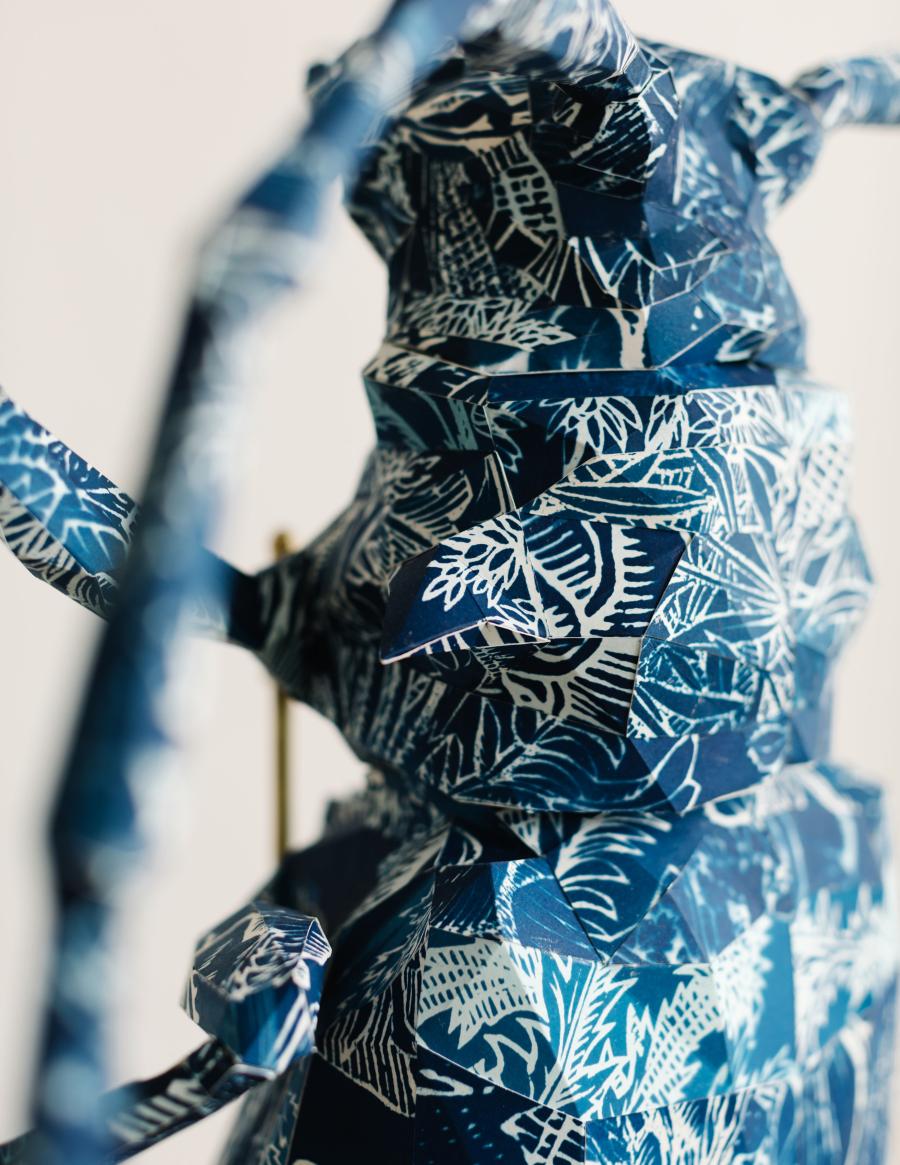 Naast de afgewerkte blauwe boktor op een sokkel presenteert Goossens ook enkele kaders. ‘Dat was niet mijn bedoeling, maar een spontane ingeving tijdens het proces. De verschillende prints waaruit ik de gaten had uitgesneden, waren gewoon veel te mooi om weg te smijten. Daarom zette ik enkele gedrukte platen achter elkaar, en lijstte die samen in. De opeenvolgende gaten geven samen een bepaalde diepte. 2D wordt opnieuw 3D.’