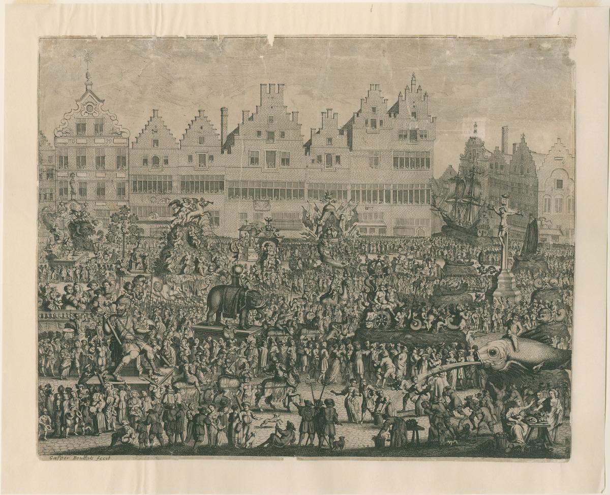 Het schip van koopmanschap bijt trouwens de spits af van deze ommegang, want alles begint in uw eeuw met handel en met vroomheid. Het is het grootste schip op de prent en het dichtst in de buurt van de Christusfiguur op het kruis. We zien het nog net vooraleer het verdwijnt in een zijstraat. Dit schip is gemaakt door het schippersambacht ter gelegenheid van de Blijde Intocht van Karel de Vijfde. Zijn plaats helemaal vooraan in de stoet is een teken privilege, van vrijheid, van koopmanschap. De stad zelf staat symbool als het hart van gans de Lage Landen, of zoals de stoïcijnse denker Justus Lipsius ooit schreef: Antwerpen is het oog van alle steden. En dit oog, maar uw oog ook en het mijne, verlangt een spektakel met bijvoorbeeld een olifant die door paarden wordt voort getrokken die dan weer door wildemannen worden gemend. De hel zien we helemaal aan de linkerkant. Rechtsonder zien we een walvis die ter vermaak mensen nat spuit en op wiens rug een gezette Neptunus is gezeten, net onder Christus die toch ook een beginnend buikje heeft; devotie en overvloed, duidelijker kan het niet.