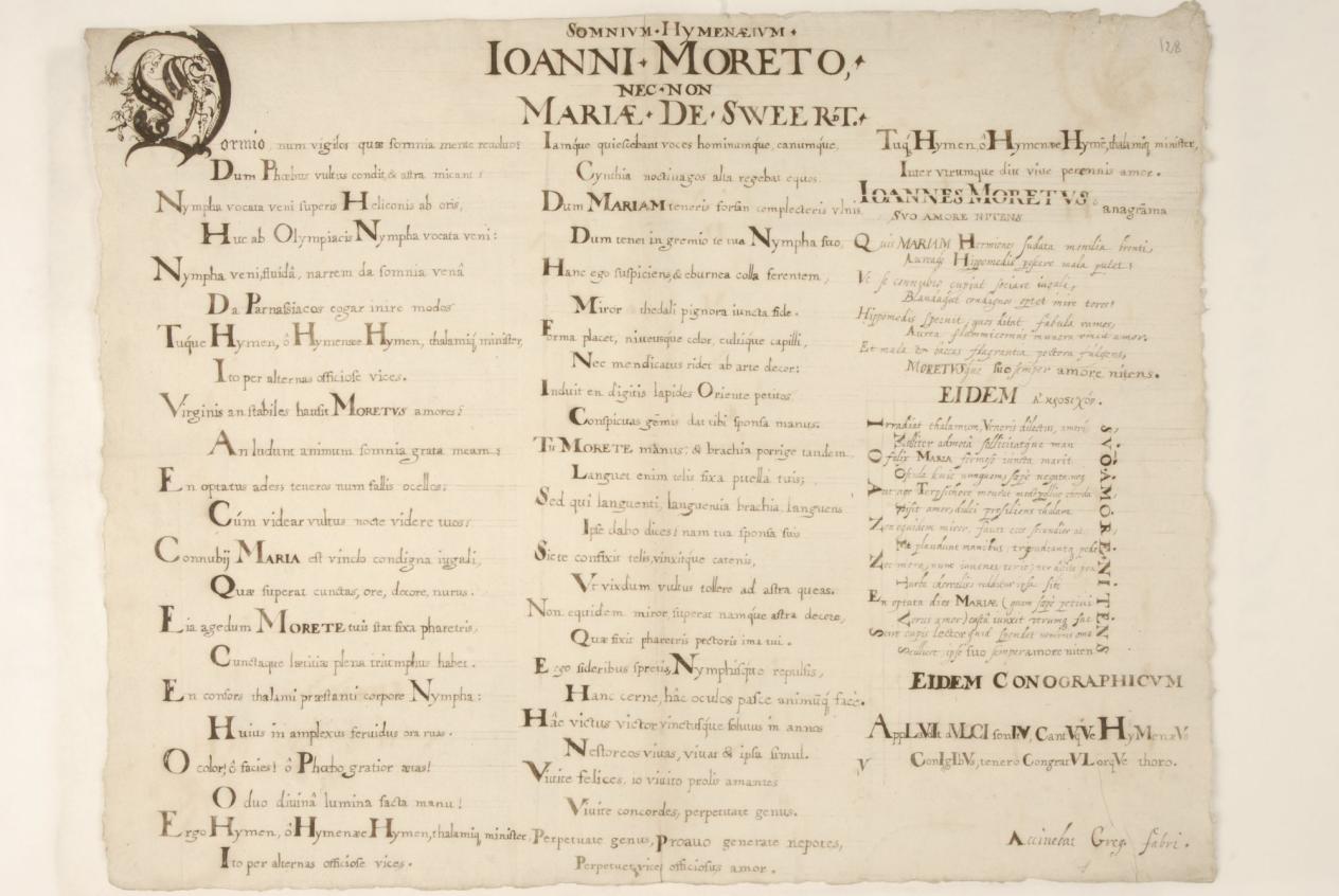 Gregorius Fabri, Somnivm hymenævm Ioanni Moreto, nec non Mariæ de Sweert, juli 1605 (MPM Arch. 1150a, fol. 182 recto)