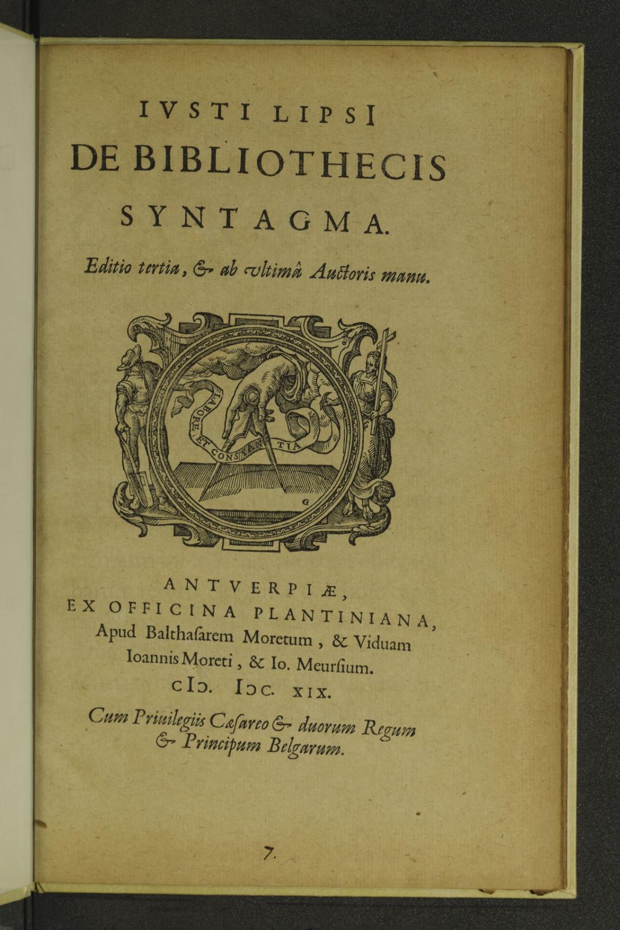 Titelpagina van Justus Lipsius, De bibliothecis syntagma, Antverpiæ, ex officina Plantiniana, apud Balthasarem Moretum, & viduam Ioannis Moreti, & Io. Meursium, 1619, 4to (MPM 4 312, fol. A1 recto)