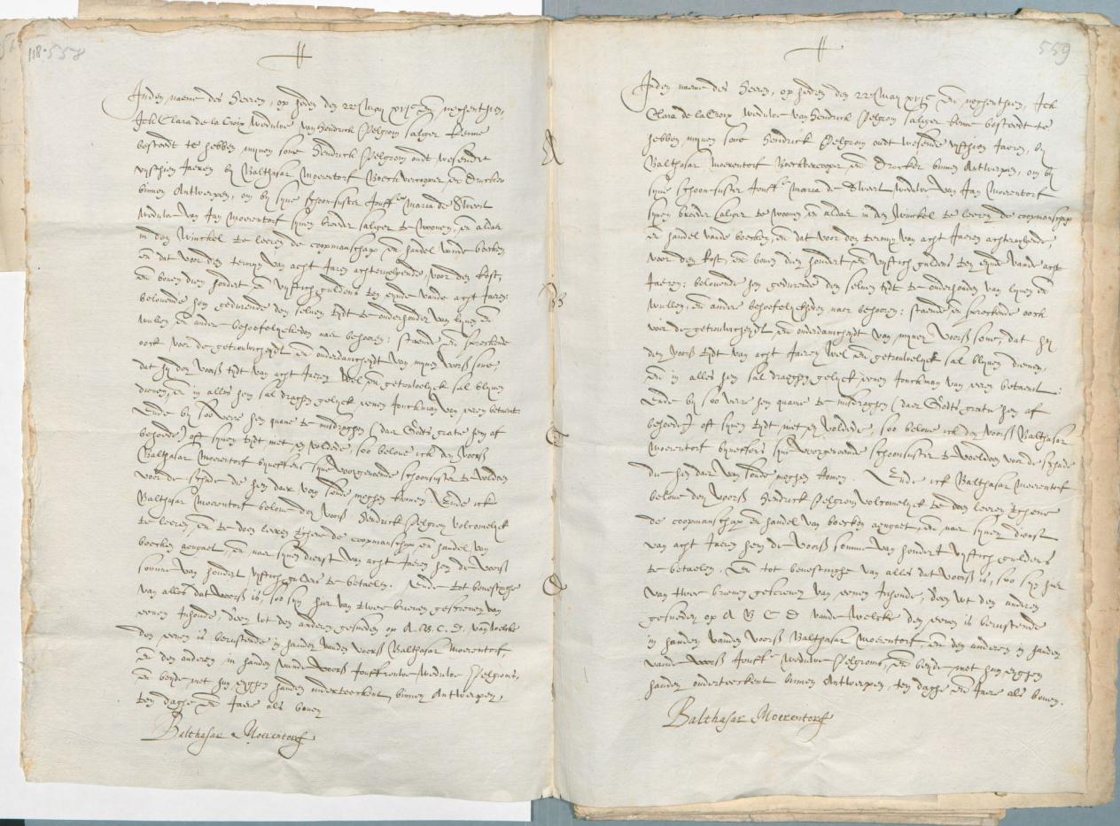 Stage-overeenkomst tussen Clara de la Croix en Balthasar I Moretus met betrekking tot Hendrik Pelgrom de Jonge, 22 mei 1619 (MPM Arch. 118, pp. 558-559)