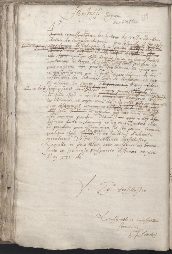 Ayant cejourd'huy receu les lectres de son Exce soussignées par V. Ill. Sie j'ay faict incontinent tout devoir de m'enquérir de ce qu'il luy a pleu m'ordonner et, n'ayant icy rien sceu descouvrir, je ne laisse à poursuivre par lectres, tant envers ceux qui ont la charge des imprimeries ès autres villes que par autres mes amis, pour sonder si je pourrois trouver quelque certitude de telle affaire, afin d'en advertir, cy-après, plus amplement Son Excellence très illustre, vers laquelle je supplie V. Ill. Sie m'excuser si, d'adventure, pour n'estre exercé d'escrire à tels Princes et Signeurs, j'auray commis quelque faute ou obmis quelque chose, tant aux tiltres qu'aux manières d'escrire, et que, pour ne tomber doresenavant en erreur, il luy plaise m'en faire advertir.