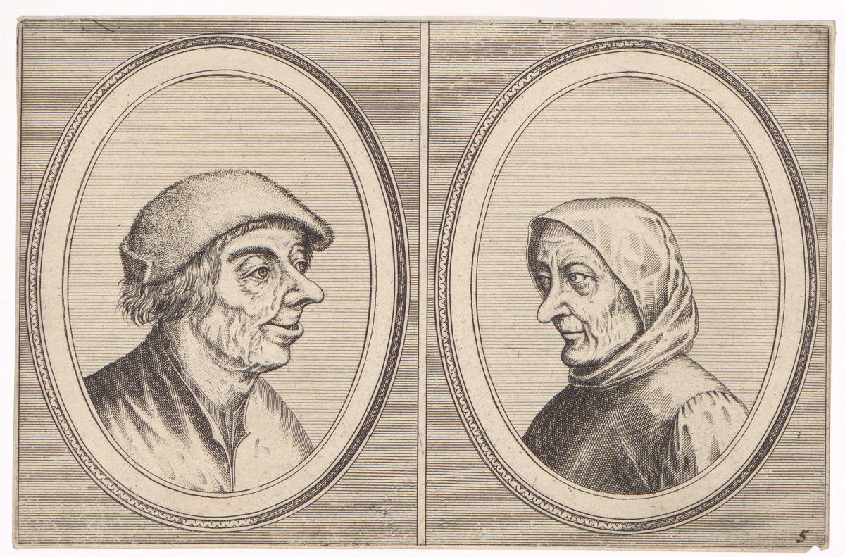 Deze vier opmerkelijke koppen worden toegeschreven aan Pieter Bruegel, maar zeker is men niet. Ook hij moet zich hebben geamuseerd bij het aanschouwen van vroedvrouwen en beulen, woekeraarsters en vrekken gelijk deze vier hier met verzonnen namen als Mondige Melis en Smerige Els, Buyltje Onver-saed en Waernar Altijt-Meer in deze ovalen of schuinsrondekens zoals deze vorm werd genoemd. Het gelaat werd als de spiegel van het hart omschreven, en reflecteerde misschien ook de ziel van het volk der Lage Landen, waar gij moet over hebben gepeinsd toen ge uw boek schreef.