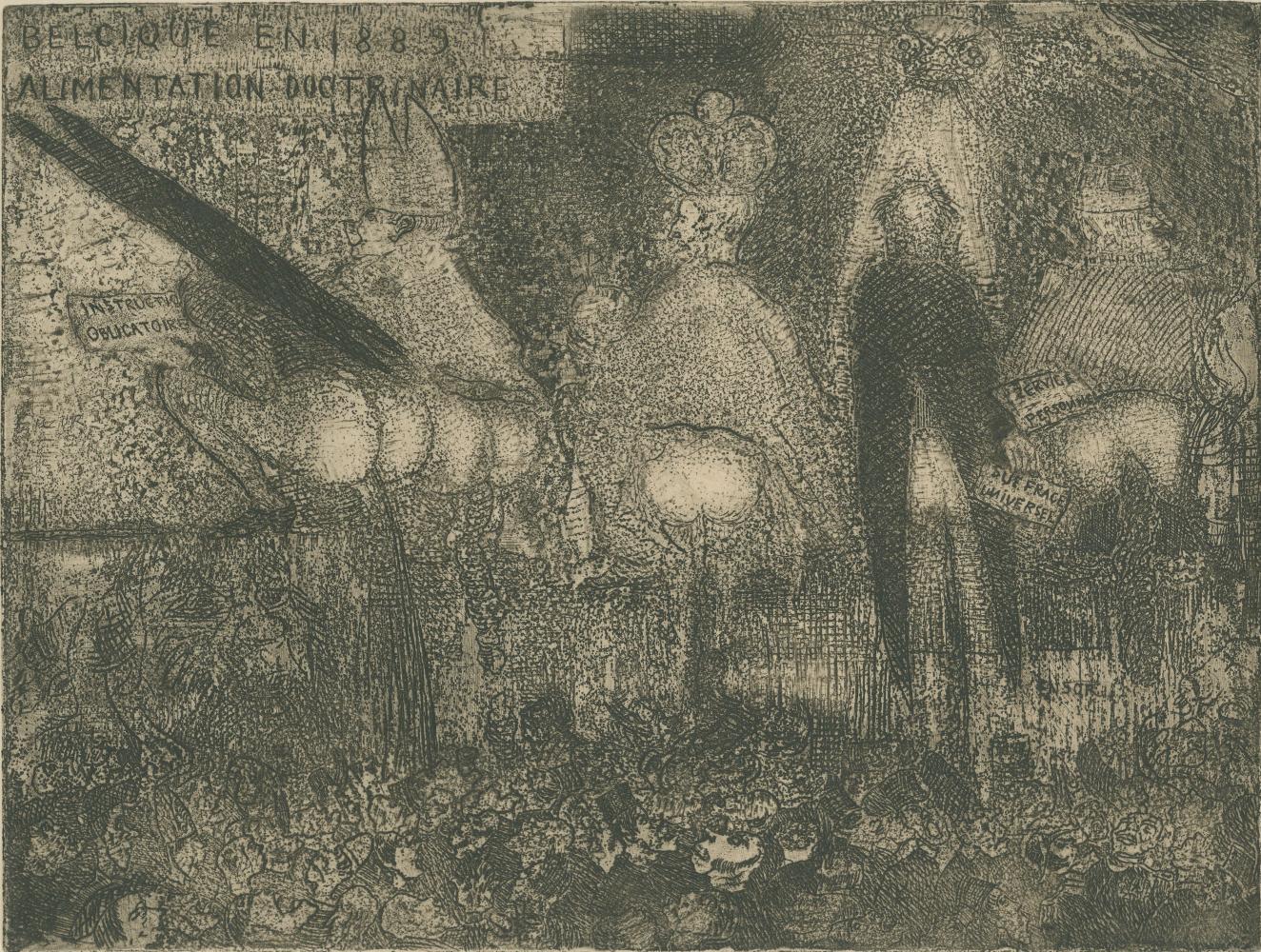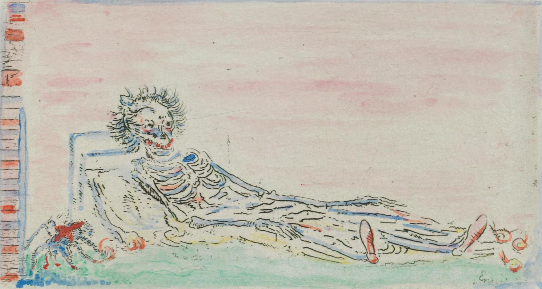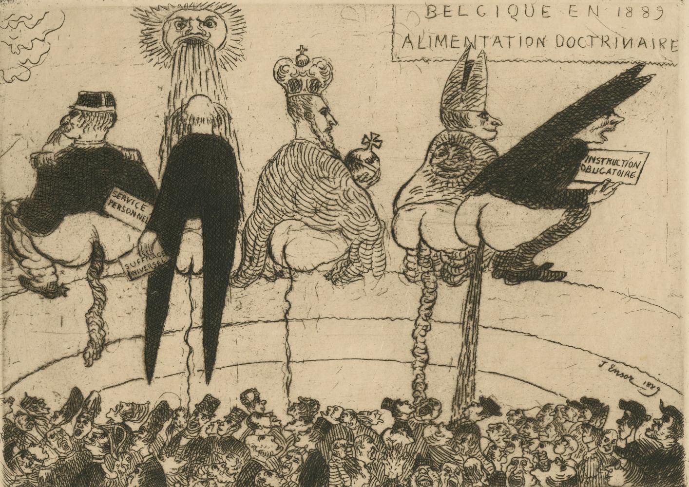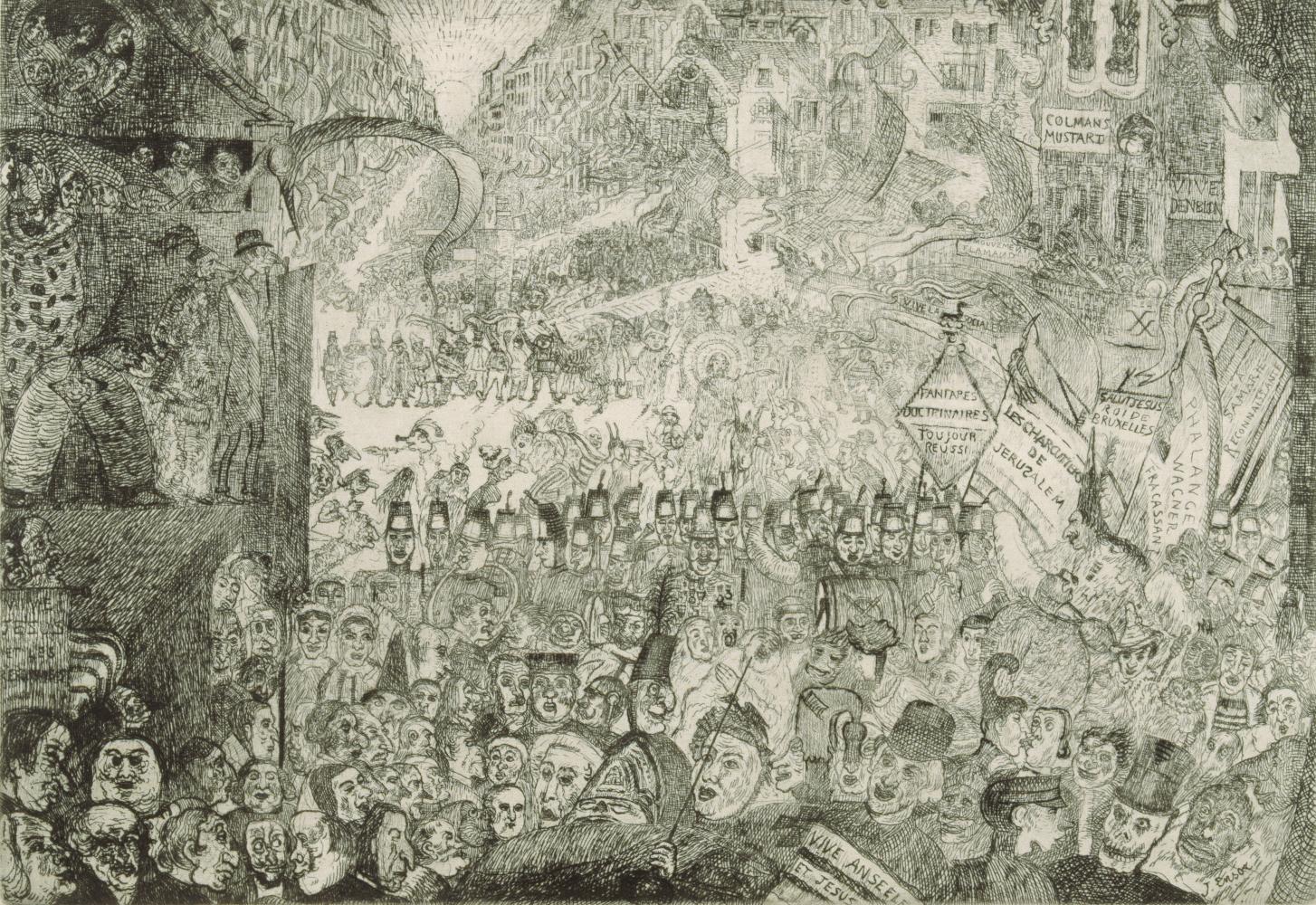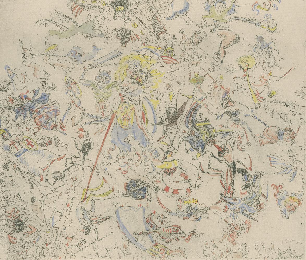 Ensors staten van verbeelding brengt voor het eerst de meest opmerkelijke resultaten van deze experimenten bij elkaar: voorbereidende tekeningen, koperplaten en verschillende staten van prenten. We tonen unieke drukken op perkament en gekleurd satijn. Ensor transformeert afdrukken tot unieke kunstwerken door ze handmatig in te kleuren met kleurpotlood, krijt en waterverf. Zo duiken er onverwachte details op, ontstaat er diepte in grote mensenmassa’s en krijgen nieuwe gestalten vorm.
