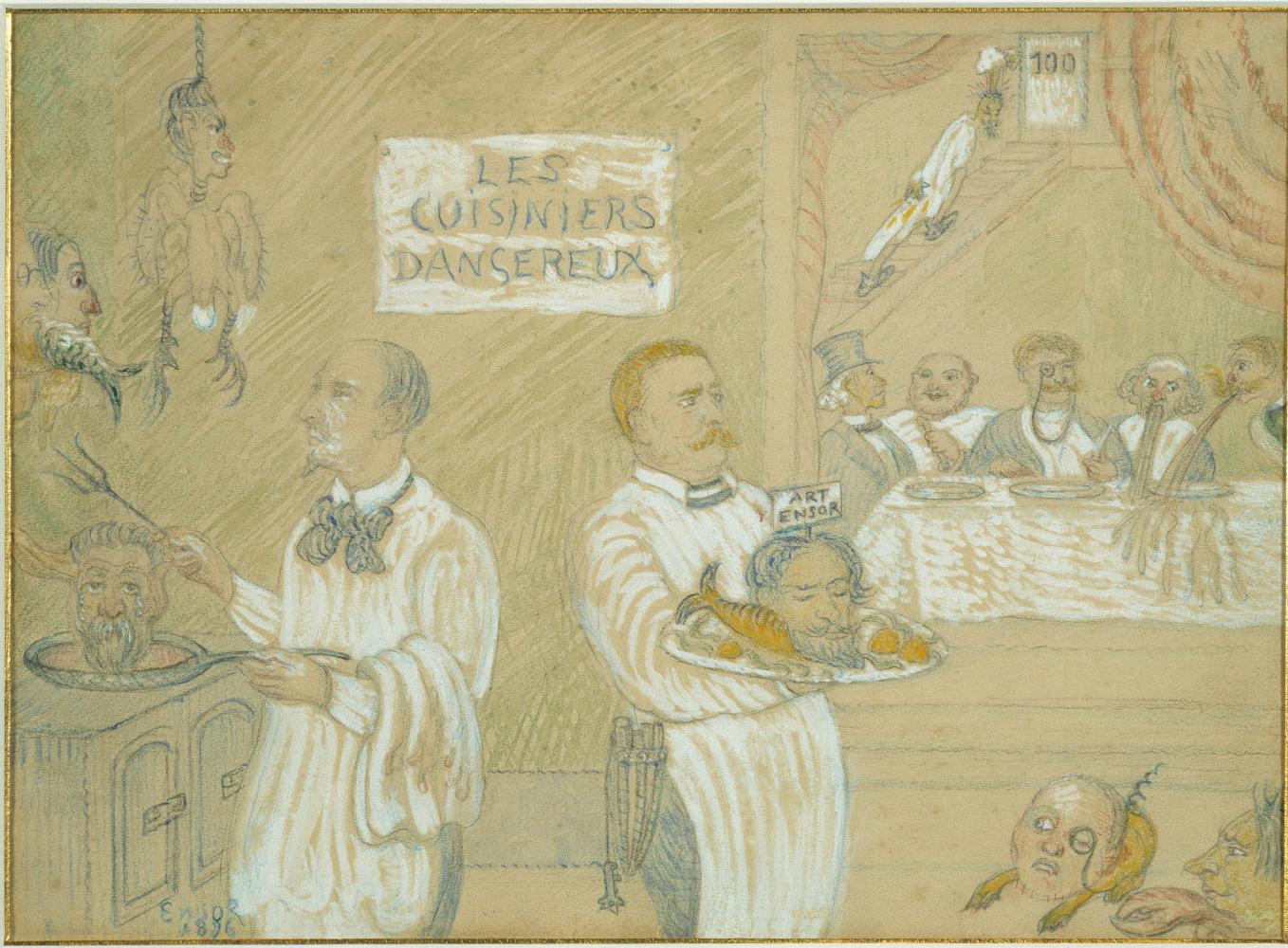 Tegelijkertijd zal in het 18de-eeuws leeskabinet van ons museum ingezoomd worden op Ensor en Verhaeren door middel van de mini-expo Ensor gefileerd door de gevaarlijke koks. Deze mini-expo vertrekt vanuit de bijzondere Verhaeren-collectie die wij bewaren en tot nog toe weinig in de aandacht kwam. Centraal staat hier de bijzondere tekening Les cuisiniers dangereux van Ensor uit deze verzameling.