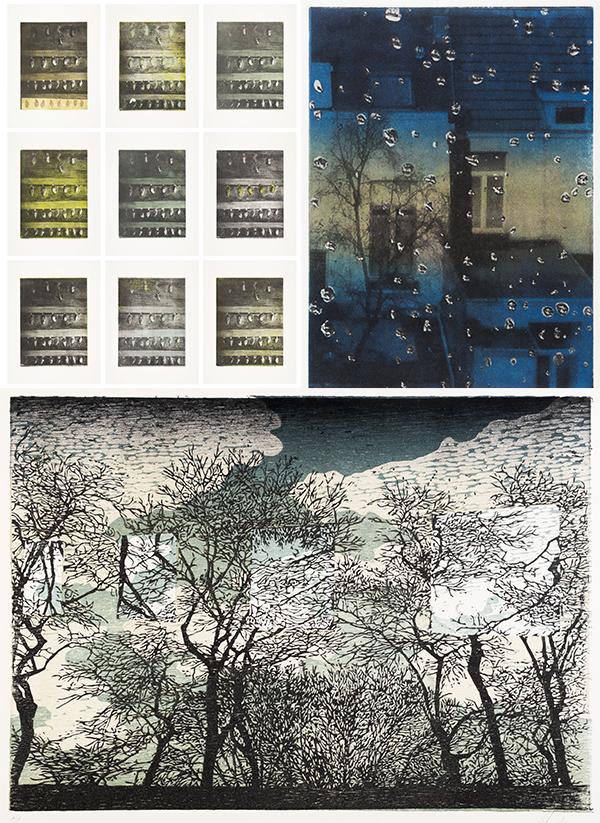 Leen Nuyts met drie werken: Cocon (9 drukken die 1 geheel vormen), Aquatint + fotopolymeerets + chine collé, 275 x 210 (x9); Bomen, Houtsnede, 530 x 730; Druppels, Aquatint + polymeerets, 530 x 430