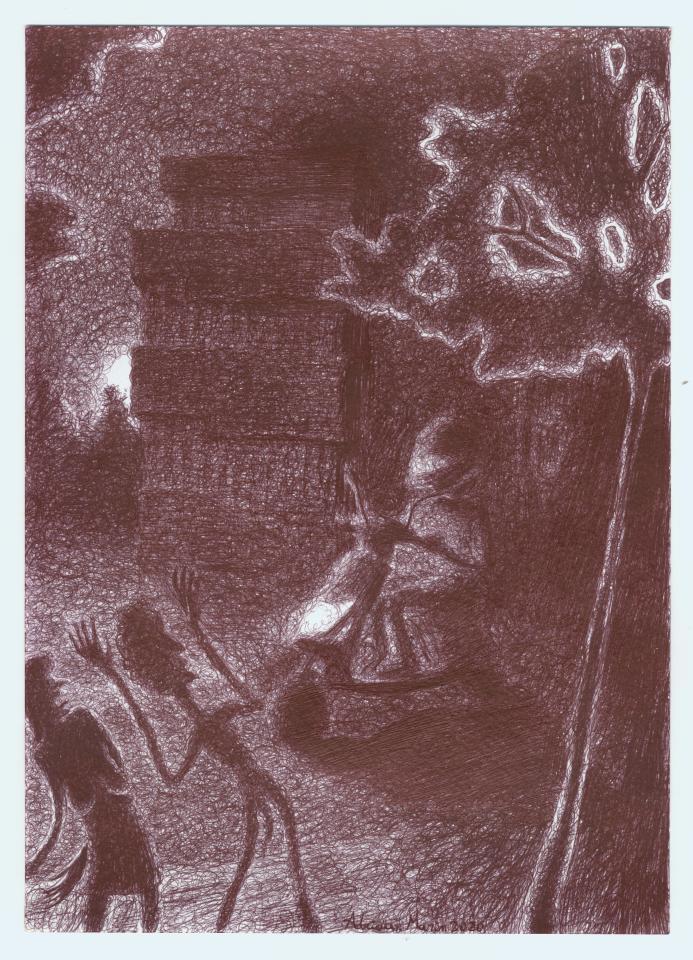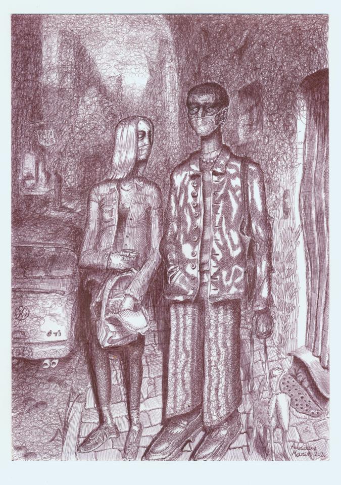 Adriaan (24) ontdekte de liefde voor het tekenen pas op zijn zestiende, toen hij z’n huiswerk steevast vol kribbelde. Na zijn diploma Mechanische Vormingstechnieken koos hij voluit voor tekenen en ging hij voor een Master Vrije Grafiek, waar hij verschillende druktechnieken leerde. Etsen, het gevoel van die roetzwarte inkt op het papier, deed z’n hart sneller kloppen, maar ook een dagdagelijkse balpen werd een tekenfavoriet. En wat hij niet onder woorden kan brengen, vindt altijd zijn weg naar een beeld.