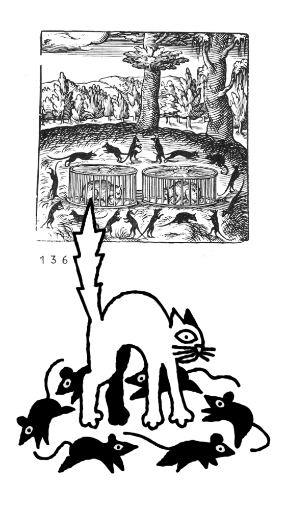 ‘De opdracht die ik me gaf, was de eeuwenoude beelden te vertalen naar mijn eigen beeldtaal. Hoe kon ik ze opnieuw interpreteren, in de wereld van vandaag?’ Die vertaling was vrij: de kat zat oorspronkelijk opgesloten in een kooi. De hond op de blokken is gebaseerd op een compositie van twee geometrische tekeningen uit een fysicaboek. En het bord met vissen is een uitvergroot detail van een bijbels tafereel.