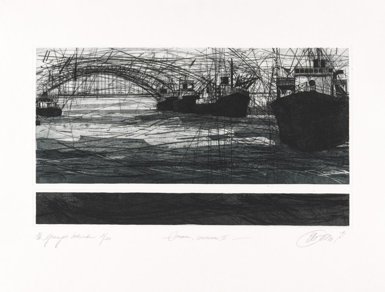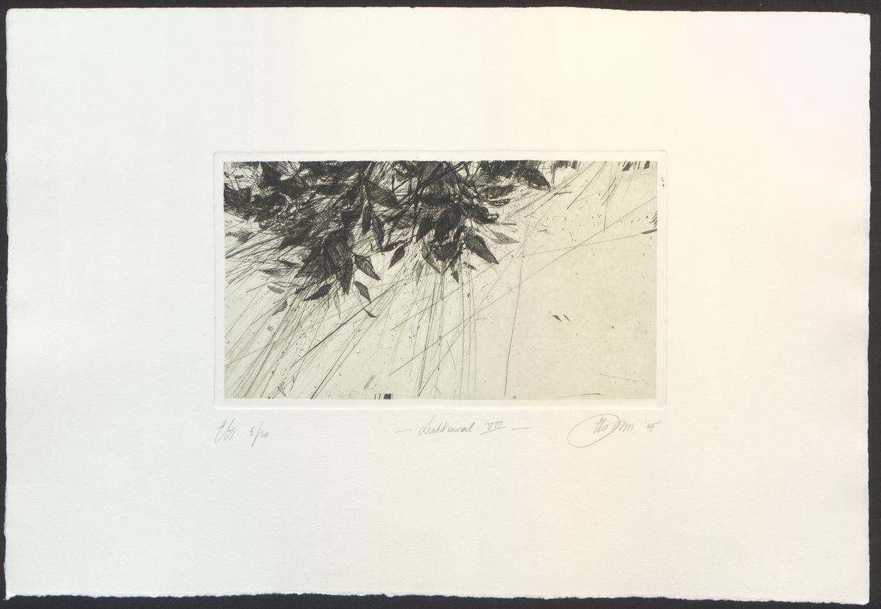 ‘Mijn schenking bestaat uit een selectie van 49 prenten, gemaakt tussen 1986 en 2007. Ik maakte in die periode allemaal zwart-wit-etsen volgens klassieke etstechnieken: lijnets, aquatint en droge naald. Meestal in combinatie, soms ook apart. Alle werken zijn eigenhandig gedrukt, in beperkte oplages van 10 à 15 exemplaren. Na 2007 ben ik de grafische technieken anders gaan verwerken waardoor unieke werken ontstaan. De schenking geeft een goed beeld van mijn eerste periode.’