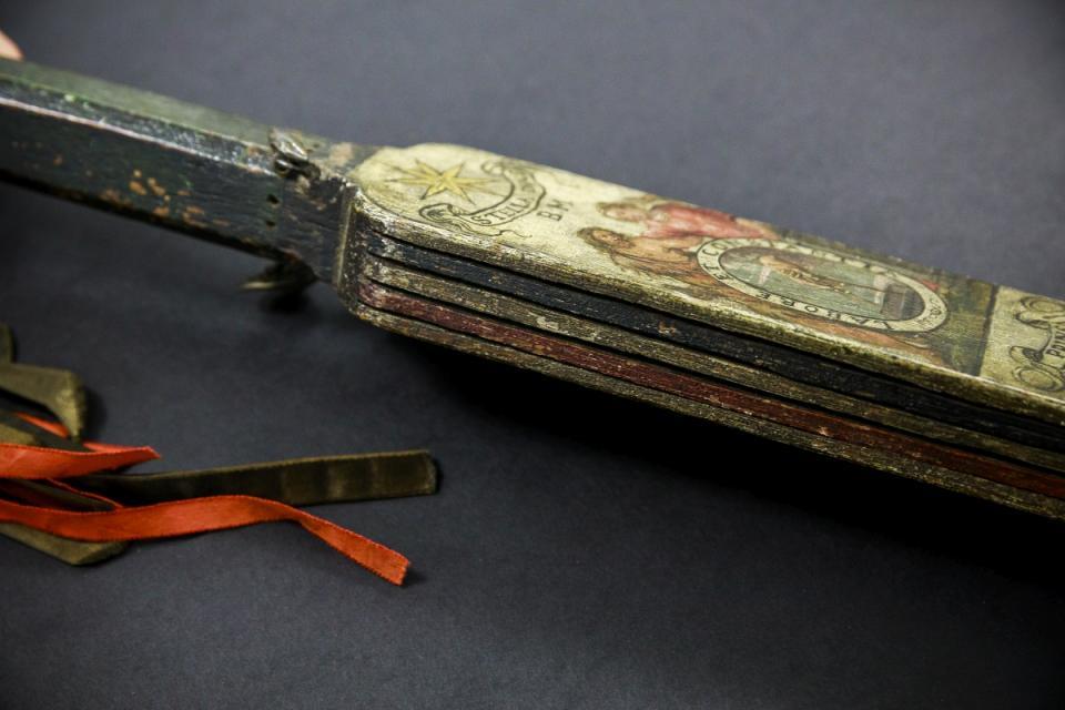Het voorwerp zou een ceremoniële brits kunnen zijn. De prins van de Kapel van de Plantijnse drukkerij hanteerde dit symbolische strafwerktuig in de ontgroeningsceremonie van de nieuwe gezellen. Na de proeftijd van 1 jaar en 6 weken, werden de nieuwe drukkers en letterzetters vrijgemaakt in een verplichte doopceremonie. De vrijgemaakte gezellen werden opgenomen in de werknemersorganisatie van de Plantijnse drukkerij. Deze organisatie met de naam ‘Kapel’ handhaafde in de plaats van de meester de tucht in de drukkerij. Daarenboven betaalde de ziekenbus van de Kapel een uitkering aan zieke gezellen. Elk jaar verkozen de vrije gezellen onder de collega’s een prins aan het hoofd van de Kapel.