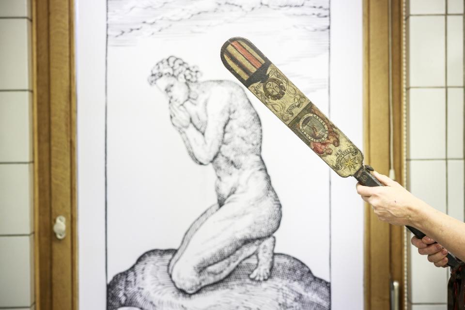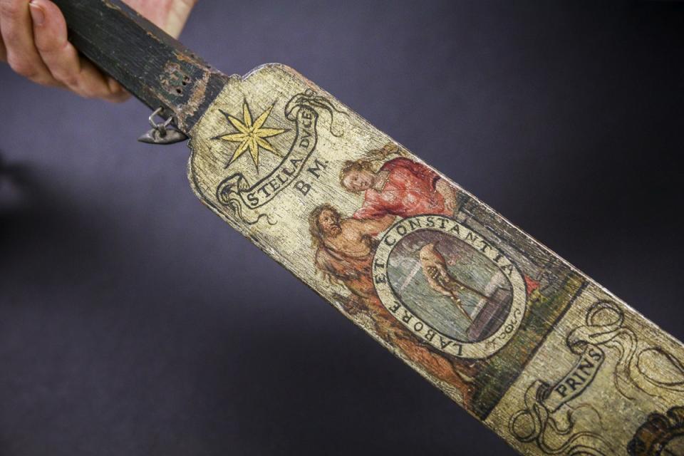 Het voorwerp heeft een handvat met linten en belletjes. Het platte blad heeft vier laterale zaagsneden over bijna de volledige lengte. De identieke schildering op de voor- en achterkant van het platte blad verwijzen naar Balthasar Moretus als “prins” in het jaar 1638. Behalve het Plantijnse drukkersmerk met de passer en het familiedevies van de Moretussen “stella duce”, bevat de schildering ook de onbekende zinspreuk “teghen Godt geen ghewelt”. Al deze elementen wijzen op een ceremoniële functie van het voorwerp. Maar in welke ceremonie werd dit mysterieuze voorwerp gebruikt? Het Museum Plantin-Moretus heeft alvast een mogelijke functie bedacht.