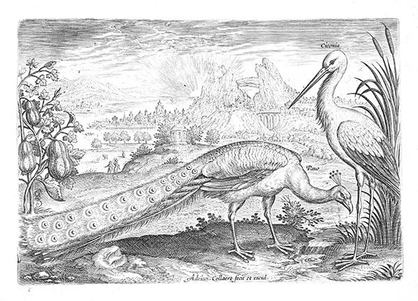 Pauw en ooievaar uit de reeks Avium vivae icones