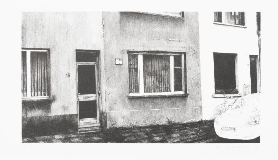 De meeste werken - lithografieën uiteraard, waar je mooi gelaagd kunt werken met grijswaarden - hebben dan ook een link met corona: een luguber parkje met een vijver waar ik ging wandelen tijdens de lockdown, een huis in Berchem zonder voordeur en huisnummer dat het ultieme lockdownhuis is waaruit je niet kunt ontsnappen en het Mechelseplein. Hiervan maakte ik twee beelden die ik combineerde: eentje met politie die de mondmaskerplicht kwam controleren en eentje van een leeg plein. Sommige beelden vielen veel donkerder uit, omdat ik noodgedwongen met een geïmproviseerd atelier moest werken, maar dat liet ik zo. Net omdat ik wilde tonen dat het soms moeilijke situaties zijn om iets te in maken.